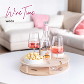 Deze wijnbar maakt indruk door zijn speelse design. Het WINE TIME-opschrift is vanuit beide richtingen leesbaar en zorgt in combinatie met de overige elementen voor een opvallende, symmetrische uitstraling.